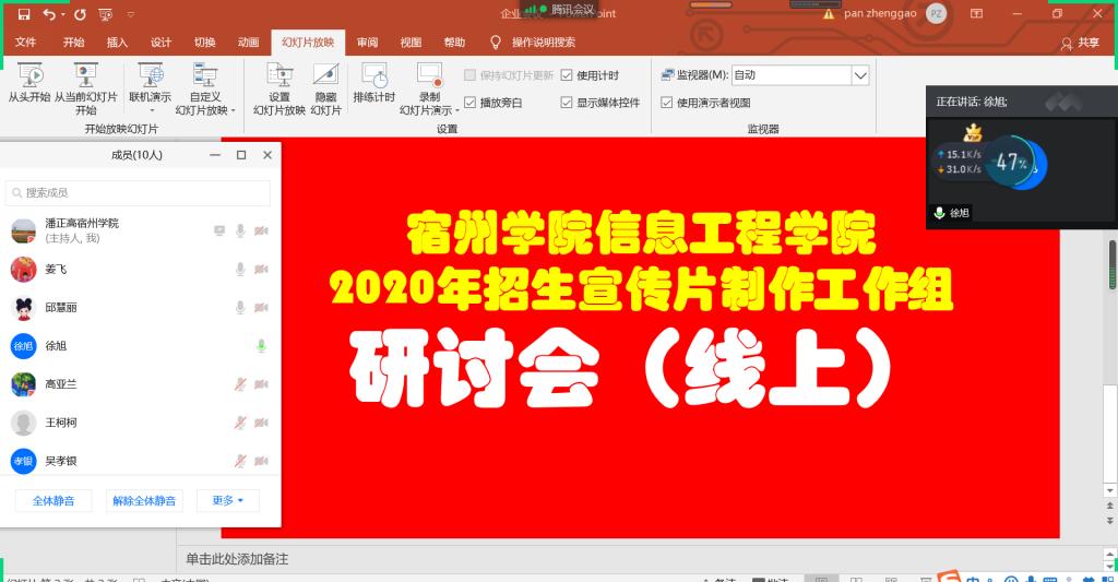 2020年7月25日20:30,为了做好2020年9499www威尼斯的招生宣传工作,在宋启祥院长和路红梅书记的指导下,9499www威尼斯召开2020年招生宣传片制作工作线上会议。实习实训中心主任潘正高、党务秘书张万礼、教学科研秘书徐旭、办公室主任刘皖苏、各专业教研室主任崔琳、姜飞、谈成访、邱慧丽、周玮、高亚兰及相关教师参加会议,会议由副院长吴孝银主持。