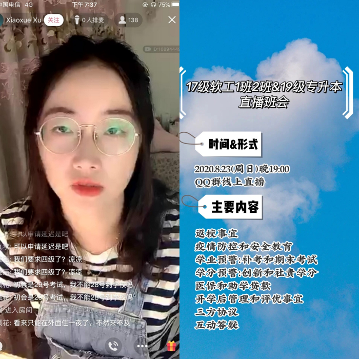 近期,学校返校安排已经公布,辅导员徐小雪老师为了学生健康安全返校。17级软件工程1班、2班和19级软件工程专升本班于823日晚上700开展了线上交流会议。参加本次会议的成员有17软件工程12班和19专升本班的全体同学和辅导员徐小雪老师。