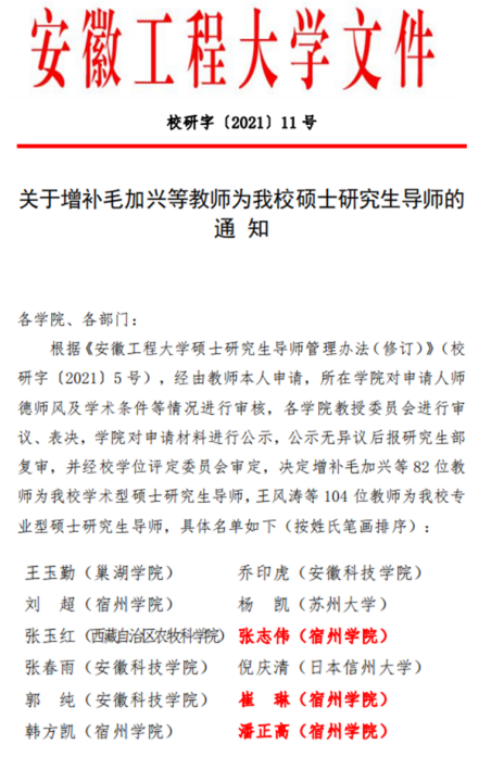 2021年9月5日,安徽工程大学发布了《安徽工程大学硕士研究生导师管理办法(修订)》(校研字〔2021〕5号)文件,公布了硕士研究生指导教师资格人员名单,9499www威尼斯崔琳教授、潘正高教授、张志伟副教授被聘为安徽工程大学学术型硕士研究生导师。此次聘任,对我校电子信息专业硕士点申报工作具有积极的推动作用。