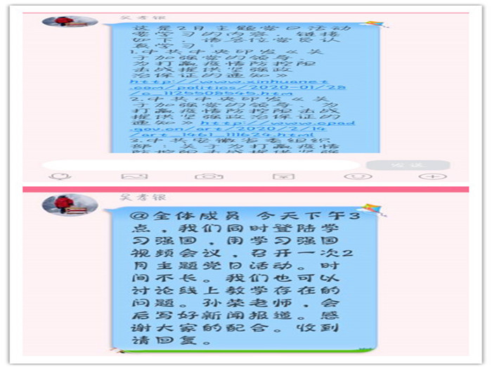首先,吴孝银带领全体党支部成员利用强国视频会议在学习强国APP和党支部QQ群进行疫情防控方面的理论学习,认真学习了习近平总书记重要指示精神,学习了《中共中央关于加强党的领导、为打赢疫情防控阻击战提供坚强政治保证的通知》、省委组织部《关于为打赢疫情防控阻击战提供坚强组织保证的通知》、省委教育工委《关于安徽省教育系统在防控疫情阻击战中进一步发挥基层党组织战斗堡垒作用和党员先锋模范作用的通知》、《安徽党委的一封信》、《致全体同学的一封信》以及《新型冠状病毒肺炎预防手册》等内容,希望各位教师党员认真践行自己的使命与担当,坚决贯彻习近平总书记坚定信心、同舟共济、科学防治、精准施策的总要求,在疫情防控斗争中挺身而出、扎实工作,英勇奋斗,紧紧依靠人民群众,坚决打赢疫情防控阻击战。