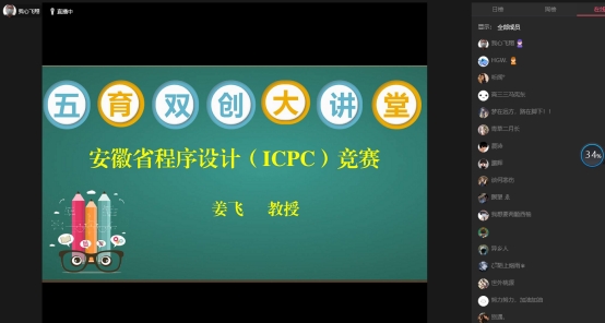 讲座伊始,姜飞老师针对“安徽省机器人大赛竞赛”进行了系统全面的介绍,围绕竞赛名称、竞赛组织机构、竞赛目的、竞赛内容、竞赛方式、竞赛流程、竞赛赛题、竞赛规则等方面进行了详细阐述,并与同学们进行了积极互动和交流。以赛促学、以赛促教、以赛促研,结合大数据专业的特点与人才培养方案,姜飞老师向同学们讲述了程序设计算法的重难点和学习技巧,并就程序设计学习过程中经常出现的问题,与同学们进行了广泛交流与在线互动。