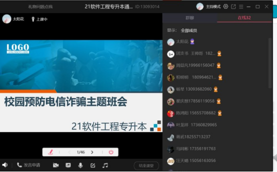 为了提高同学们安全防范意识,让同学们在平时的生活学习及工作中不受不法分子的诈骗,21软件工程(对口)班、21软工专升本班于2022年9月15日在实习实训楼A楼A104和线上分别召开了防诈骗主题班会。