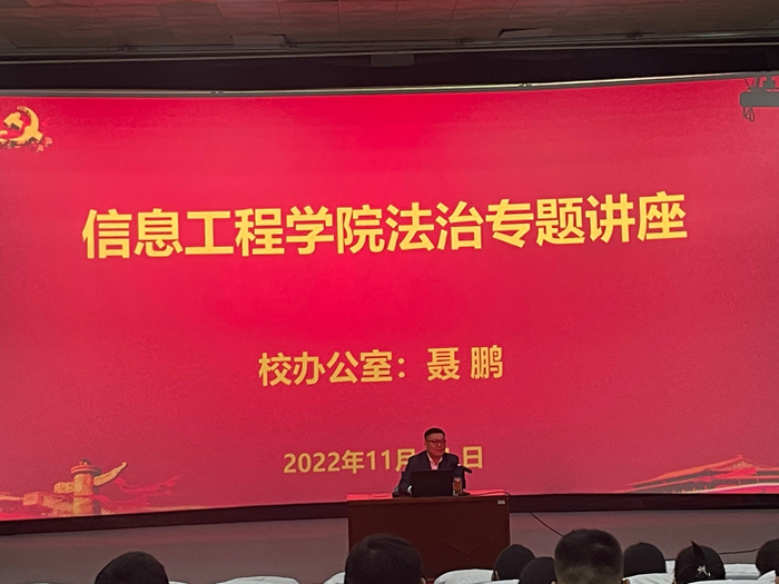 为提高同学们的法律意识,增强同学们的法制观念以及普及安全防范知识,9499www威尼斯于11月21日晚在大学生活动中心举办法治专题讲座。邀请校办公室法治科科长聂鹏作了“争做新时代尊法、学法、守法、用法的大学生”为主题的讲座,全体大一新生参与了讲座。