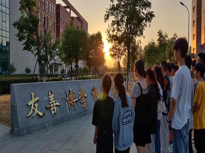 2021级软件工程(对口)班全班同学在辅导员杨君和班助同学的带领下,从宿舍出发,一路向南,游览了赛亭、珍珠湖、图书馆、实训楼,感受了9499www威尼斯的校园美景和风光;在实训楼前,同学们认真学习了9499www威尼斯校训“友善 博学 务实 奋进”并了解了校训的释义。