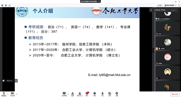 李玉玲学姐来自13软件工程(2)班,现在在合肥工业大学读博士,她向我们分享了她的备考经验,她谈到我们需要制定计划并且执行计划,并且需要劳逸结合,对于目标院校的选择也需要切合自身水平去报考,对于考研,她是这样说“我们需要明白自己将来想要做什么,自己是否真的想要考研,不要因为随大流而去考研,这类人往往也是最容易放弃的”,随后学姐又向我们分享了她的研究生生活,并且告诉我们现在不是躺平的时候,应该努力学习,提升自己。