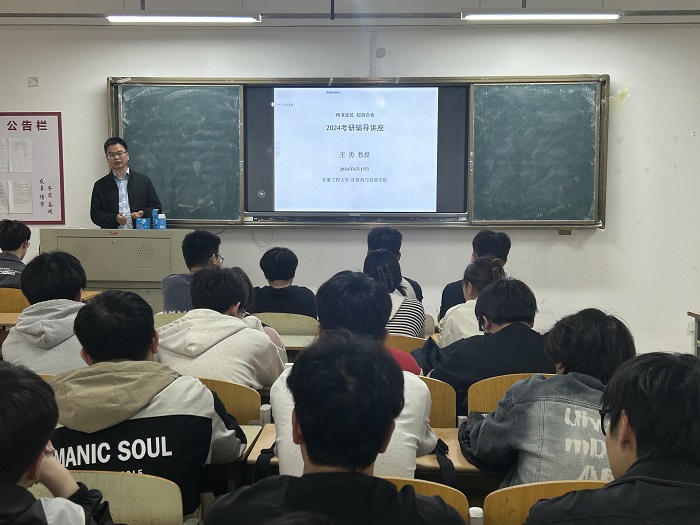王勇教授以“精准定位 超越自我”为主题,主要内容包括:安徽工程大学计算机与信息学院近3年招收研究生录取率情况,专业课考试科目,学生考研定位分析,团队科研方向及成果,学生研究生毕业就业升学情况等。报告结束后,王勇教授与学生进行了深入交流。